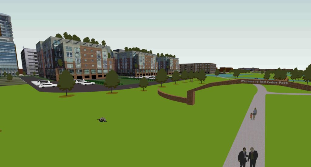 The project, located at 203 S. Clippert St, will bring new life to Michigan Avenue by building a strong connection between Lansing, East Lansing and MSU. Almost 10 years in the making, the $250 million development will include student housing, market-rate apartments, two hotels and an assisted living facility, as well as restaurants, retail space, public park space and a connection to the Lansing River Trail. This transformational project, when completed, is expected to create 300 new jobs in the city. Since the official groundbreaking in October 2019, earth moving and site prep activities have been well underway. Included in the project will be a twenty-acre park with trails and water features open to the public. The project will also retain and naturally clean millions of gallons of rainwater runoff, which currently run directly into the Red Cedar and then the Grand River whenever there is a heavy downpour. The result will be a cleaner river for the public to walk along, wade, fish, canoe and kayak in.